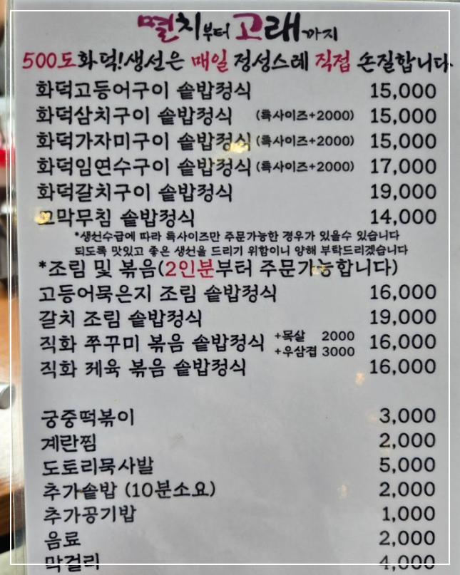 그 말처럼 메뉴판을 보니 생선구이, 조림, 꼬막, 쭈꾸미까지 바다 요리가 가득했어요.