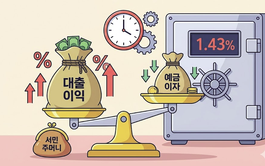 즉 '예대금리차'가 여전히 1.43% 포인트에 달합니다.