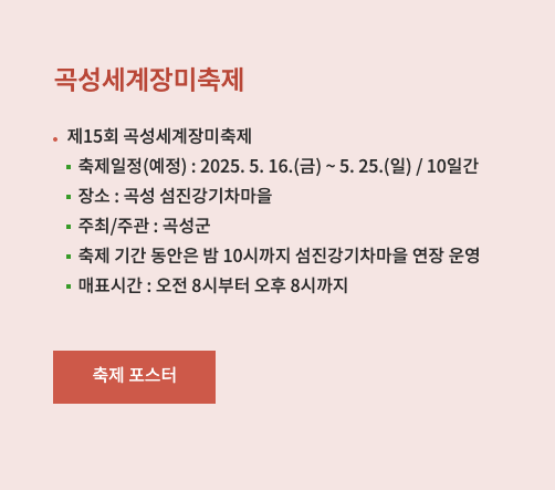 - 곡성군민, 국가유공자, 장애인: 무료 입장!