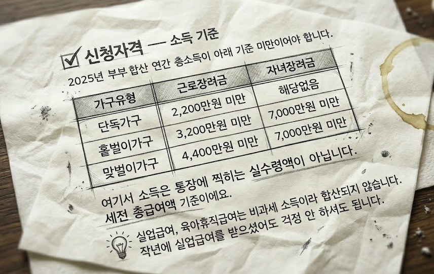 2025년 귀속 근로장려금·자녀장려금 신청자격, 가구별 지급액, 2026년 홈택스 신청방법까지 한 번에 정리했습니다. 단독·홑벌이·맞벌이 가구별 금액과 신청기간을 확인하세요. 신청 기간은 2026